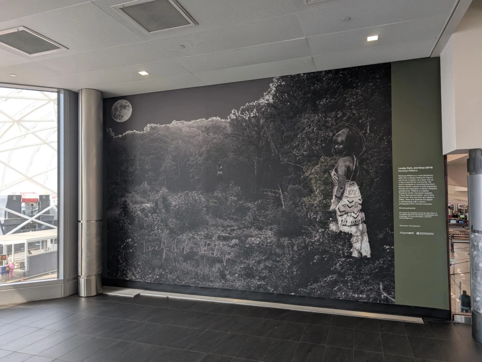 Lovely, Dark, and Deep was first commissioned for the exhibition Re/Devaluing Colorism at the University of Texas San Antonio. Currently it is on display at the Hartsfield-Jackson Airport in Atlanta, Georgia. The title nods at the controversial legacy of the relaxer haircare brand Dark and Lovely inviting contemplation about black beauty standards, identity and if certain parts of our own culture truly serve us. The piece is also a direct line from a Robert Frost poem where darkness is seen as inviting, exciting, and a fertile soil essential for abundance. It is a quiet reversal of the dominant narratives around blackness and darkness -culturally, socially, and politically that invites reflection on how nurturing blackness creates possibilities of collective flourishing.
